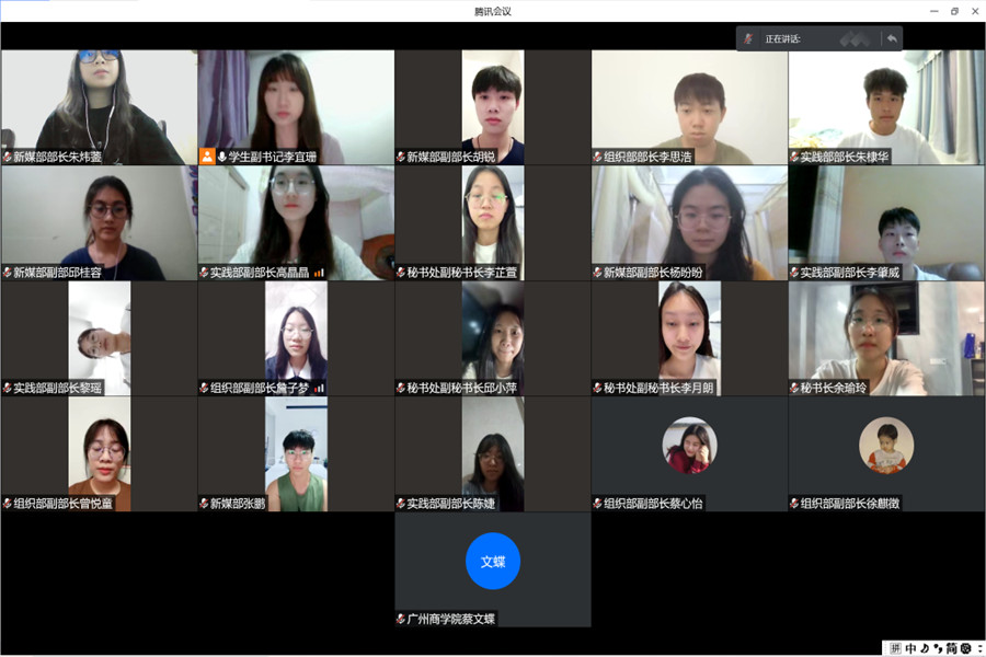 千帆竞发,百舸争流。为促进团委工作的发展,增强各位工作人员之间的凝聚力。beat365平台官方网站团委于7月19日晚8:00在腾讯会议平台召开beat365平台官方网站团委2022-2023学年新任工作人员第一次见面会,出席本次大会的有beat365平台官方网站团委书记蔡文蝶、副书记李宜珊、秘书长余瑜玲、组织部部长李思浩以及团委全体新任部长。