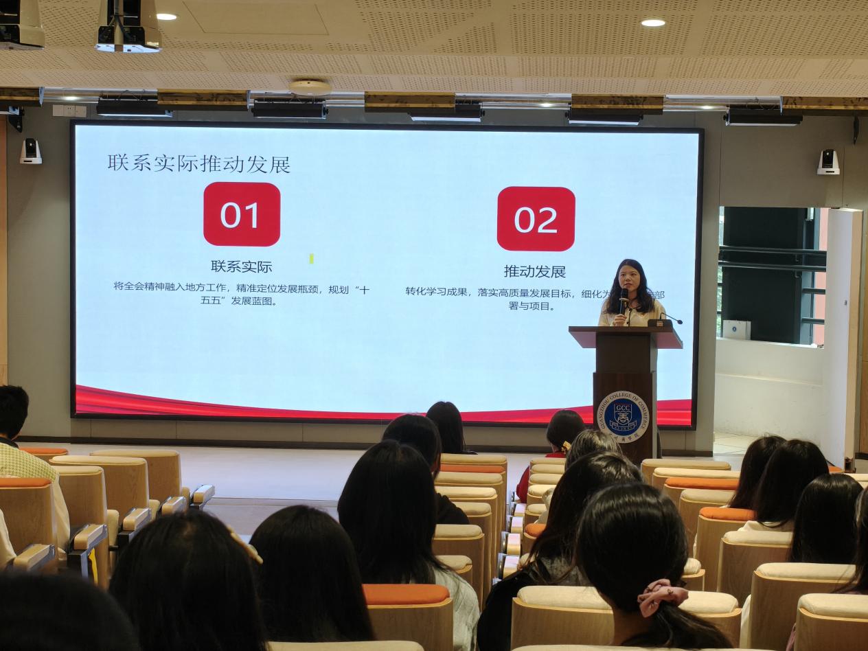 随后,蔡文蝶围绕党的二十届四中全会核心议程展开讲解,深入剖析“十四五”时期取得伟大成就的重大意义。她通过列举经济增长、脱贫攻坚成果巩固、科技创新突破等具体案例,生动展现“十四五”期间我国在各领域取得的辉煌成就,让同学们在数据与事实中坚定发展信心。同时,蔡文蝶重点阐释全会提出的指导思想与“六个坚持”原则,指出这是确保“十五五”规划沿着正确方向推进的根本遵循,要求同学们将原则内涵融入日常学习与思想建设,始终保持政治清醒与立场坚定。此外,她还结合“十五五”规划建议中的十二项战略任务,如推进乡村全面振兴、优化区域经济布局、繁荣发展社会主义先进文化等,以及“强化全会精神学习”“推动落地见效”“建立长效机制”等落实举措,强调“理论学习不能浮于表面,需转化为具体行动”,鼓励同学们以实干反对形式主义,将个人成长与国家战略需求相结合。