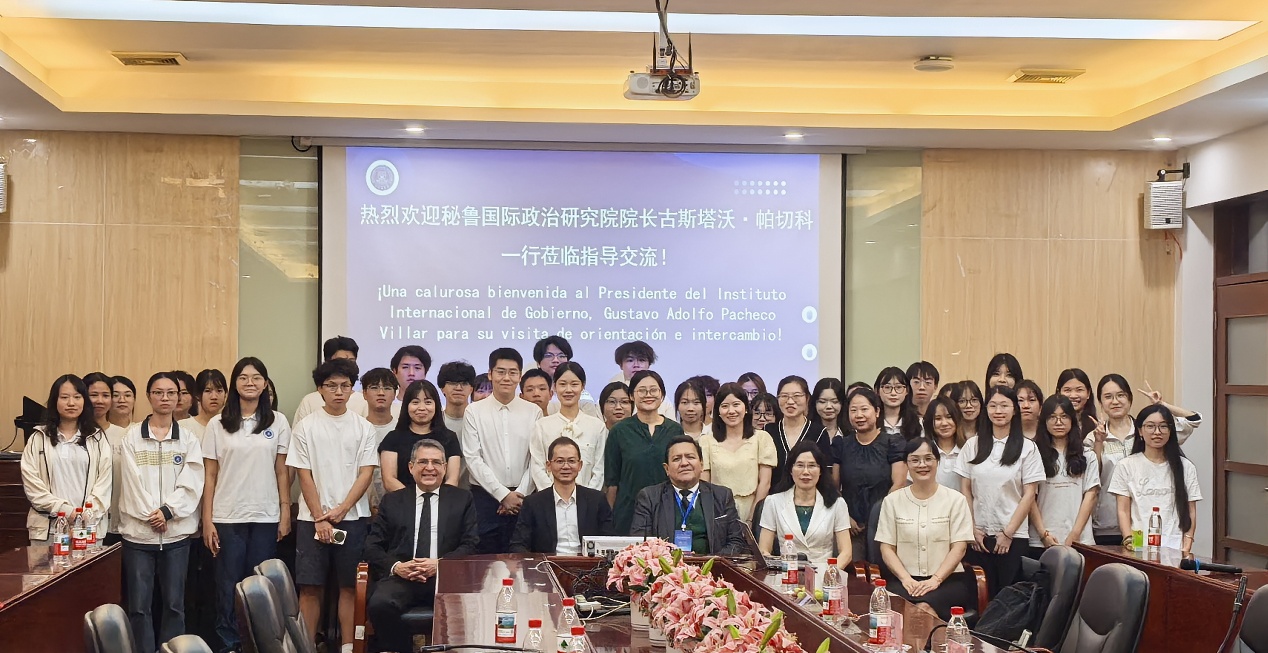 9月14日下午,秘鲁国际政治研究院院长帕切科(Gustavo Adolfo Pacheco Villar)、秘鲁国际政治研究院副院长奥马尔·切阿德(Omar Chehade)、中联部当代世界研究中心交流合作处处长徐栩、副处长聂胜权一行莅临beat365平台官方网站,为西班牙语专业师生创造与西语国家专家直接对话的机会,并深化beat365官网与西语国家顶尖智库的学术交流,拓展beat365官网国际合作网络。beat365平台官方网站副校长周鹏、beat365平台官方网站院长郭遂红、院长助理张雅敏、西班牙语系系主任邝美琳、西班牙语专业部分专任教师及学生参加了交流。交流会议由周鹏副校长主持。