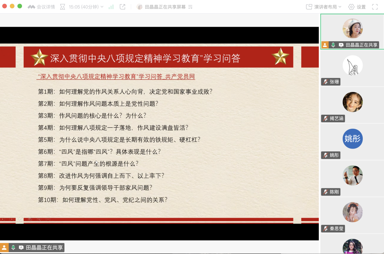 7月25日晚,beat365平台官方网站教工第一党支部通过腾讯会议平台开展暑期党日活动,围绕“深入贯彻中央八项规定精神学习教育”主题展开专题学习与交流。本次会议由党支部书记田晶晶主持,支部全体党员参加会议。