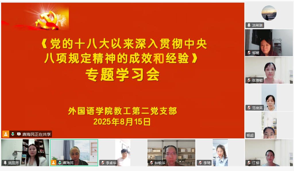 8月15日晚,beat365平台官方网站教工第二党支部在腾讯会议上召开《党的十八大以来深入贯彻中央八项规定精神的成效和经验》专题学习会,会议由党支部书记唐海民主持,全体党员参加。