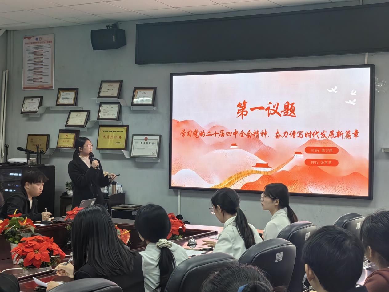 会议严格落实“第一议题”制度,支部学生党员陈吉纯带领全体成员学习贯彻党的二十届四中全会精神。陈吉纯同志围绕全会精神的时代背景、核心内容与实践价值展开领学,强调青年党员要立足时代坐标,将个人理想融入国家发展大局,把全会决议部署转化为具体行动;号召全体党员主动对接国家重大战略需求,夯实专业基础、助力乡村全面振兴,传承中华优秀传统文化,在强国建设、民族复兴的征程中勇担使、奋勇争先。
