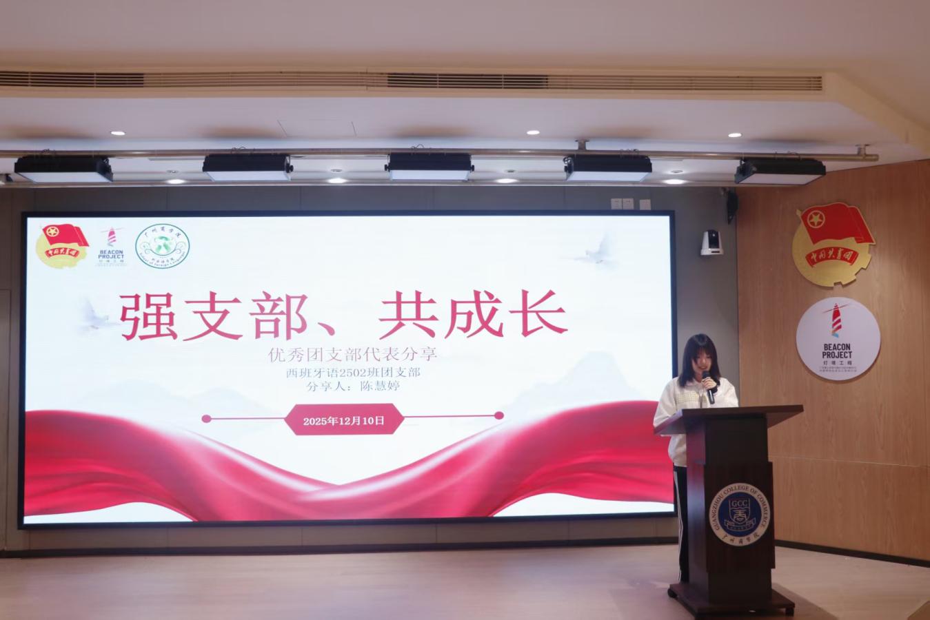 三位优秀团支部代表围绕团日活动策划与团支部建设展开经验分享。24级英语专业3班团支部代表林星如从如何增强活动趣味性,调动同学们的积极性,进行经验传授;24级英语专业2班团支部代表魏晓蕾通过五育并举理念,为大家示范如何丰富活动内容,深化活动内涵;25级西班牙语专业2班团支部代表陈慧婷围绕“西语学习”与“文化体验”相结合的团日活动设计思路,将专业特色融入团日活动中,展现支部风采。